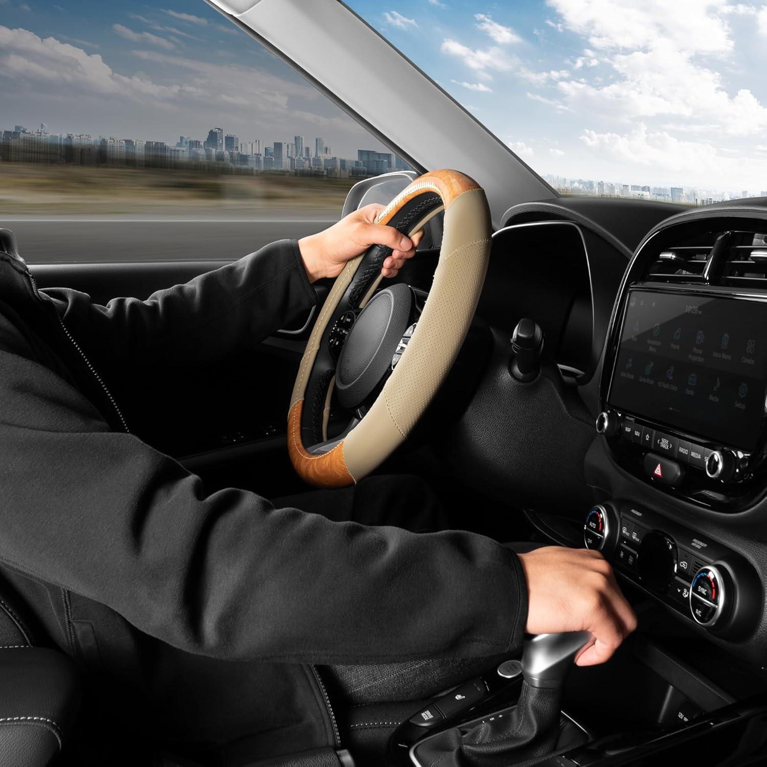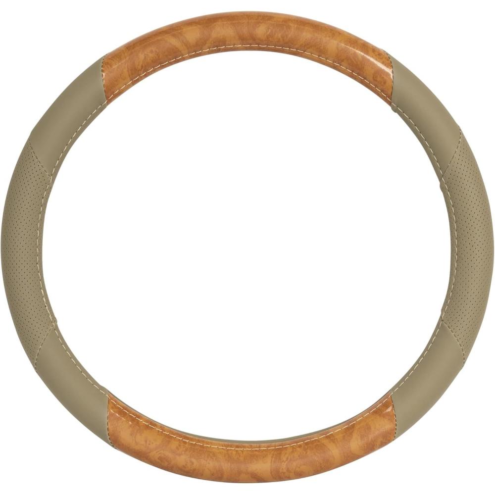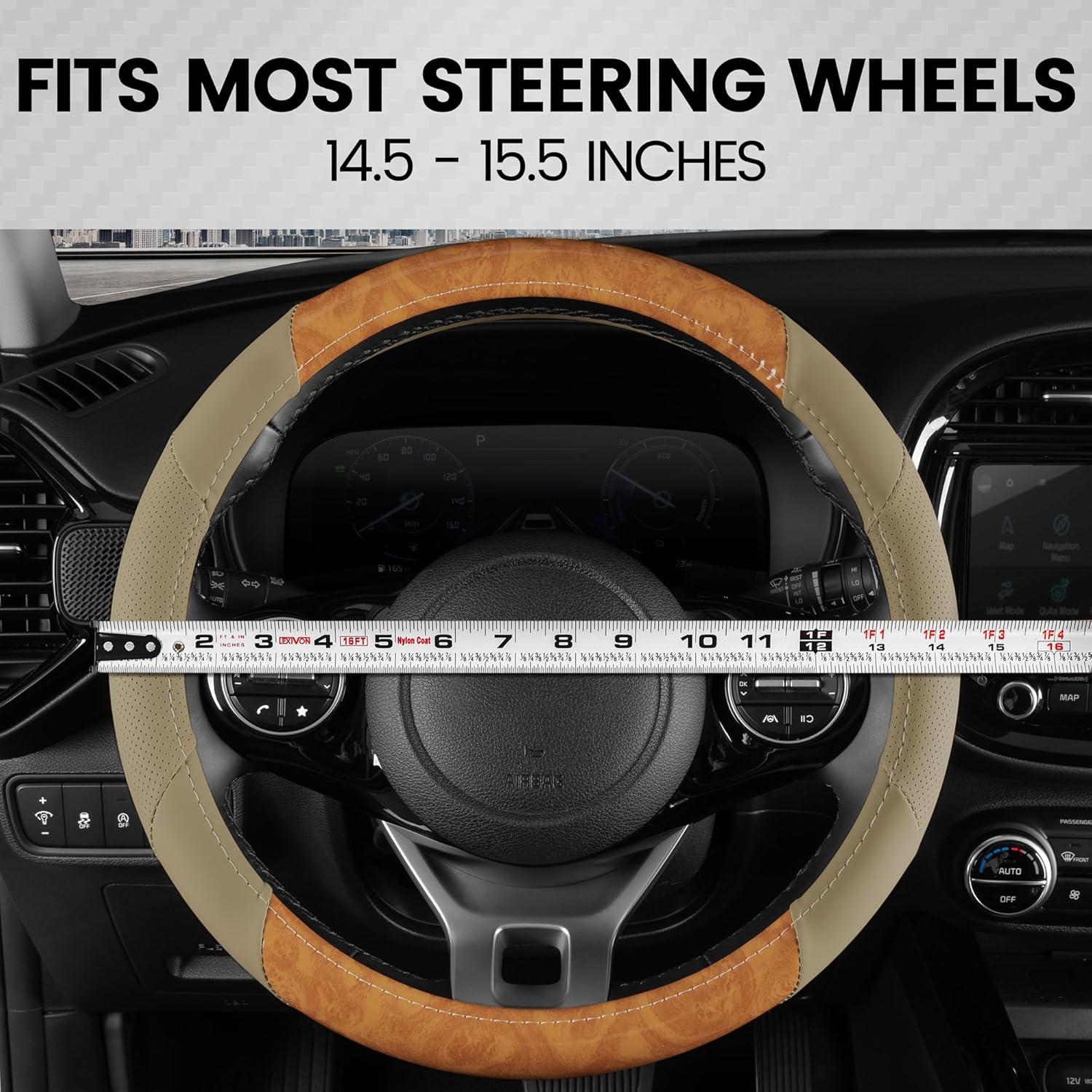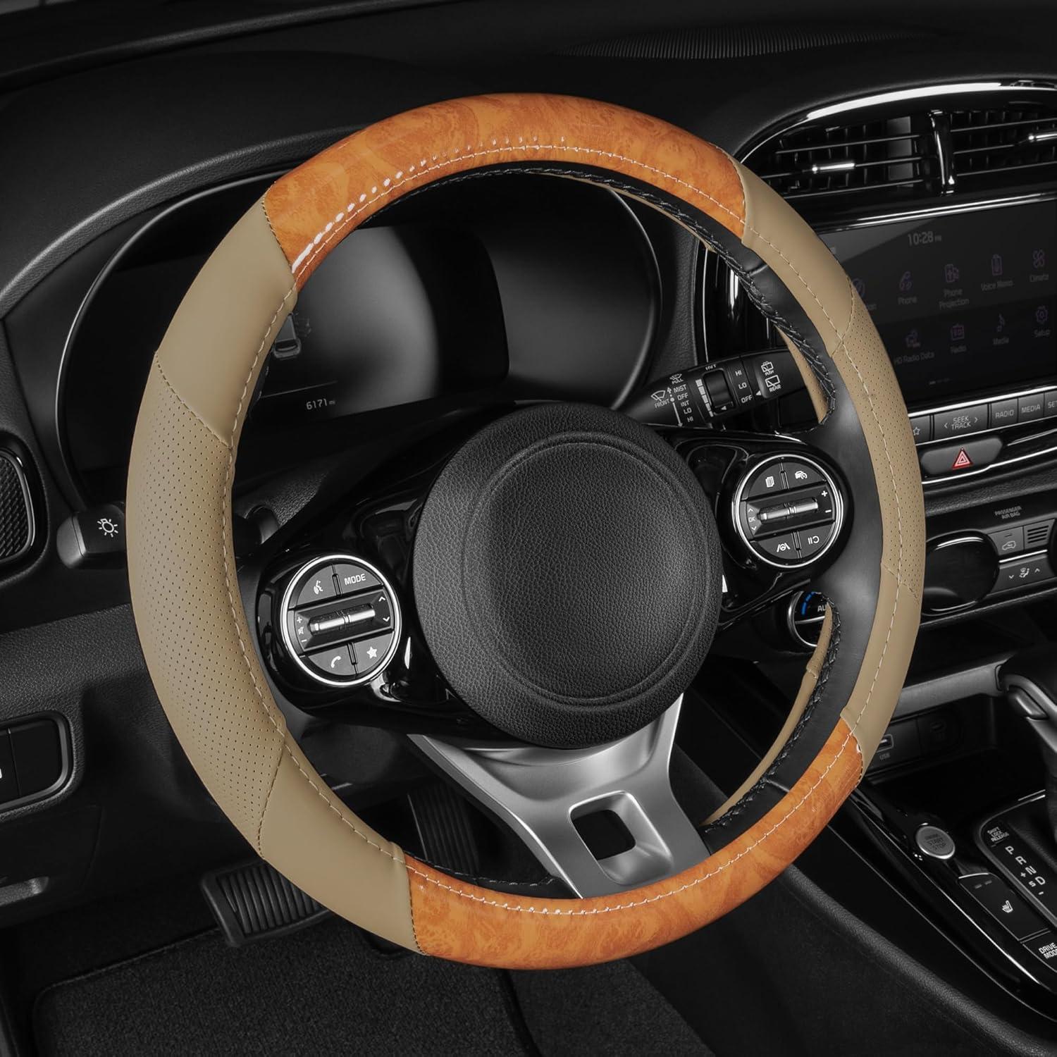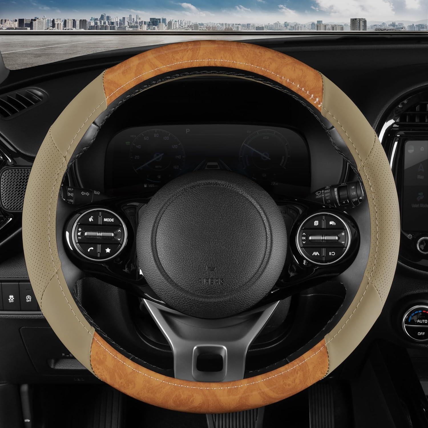 BDK BurlwoodLux Wood Grain and PU Leather Beige Steering Wheel Cover – Sport Grip for Car Auto SUV Trucks(Beige)