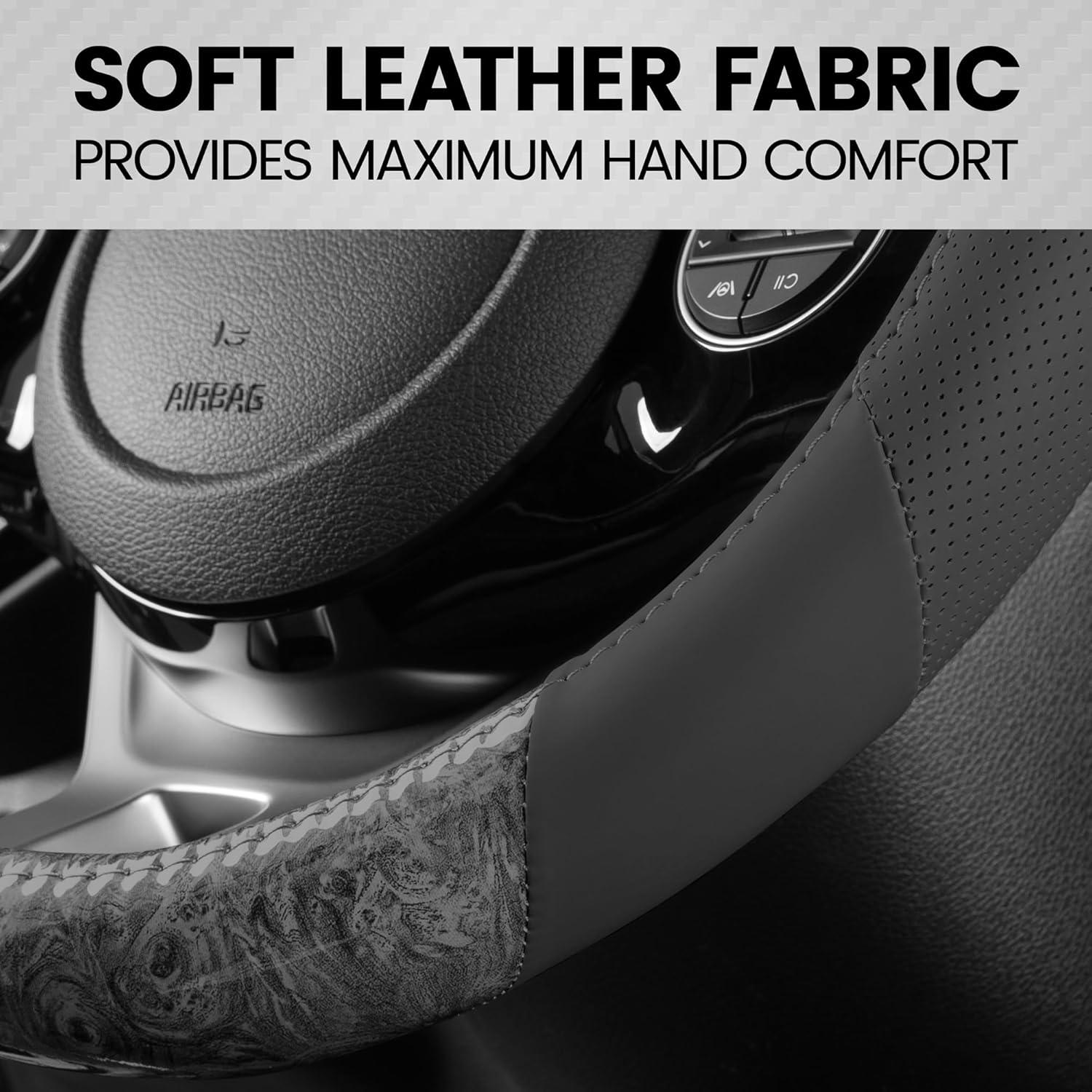 BDK BurlwoodLux Wood Grain and PU Leather Beige Steering Wheel Cover – Sport Grip for Car Auto SUV Trucks(Gray)