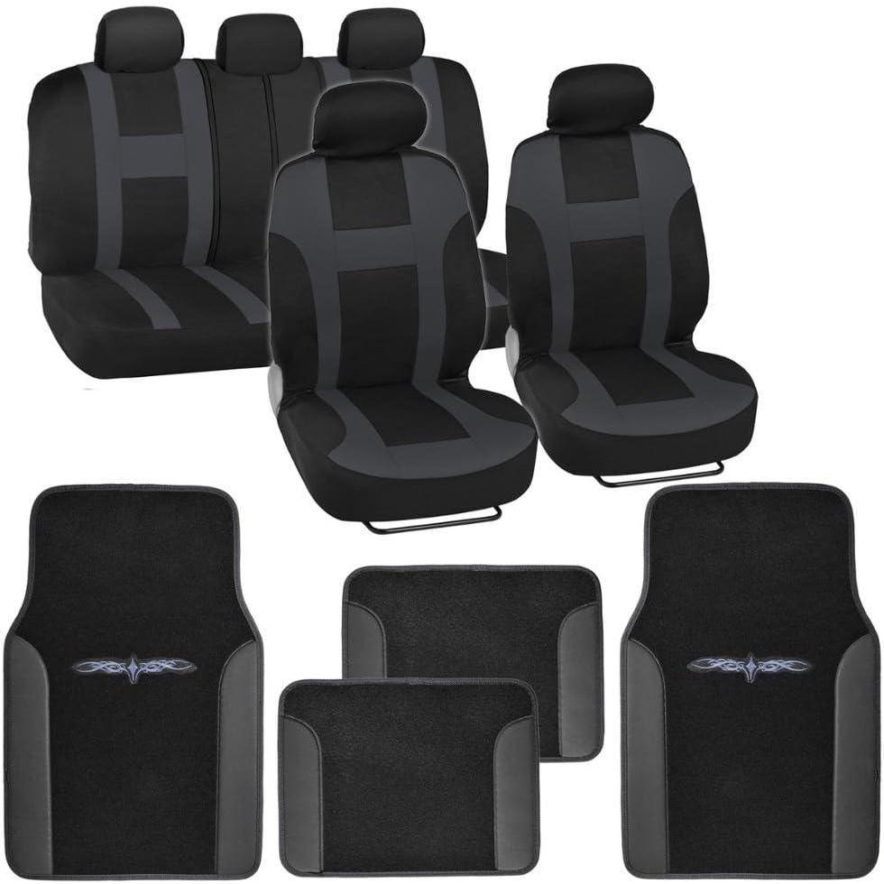 Black & Pink Car Seat Covers w/Split Bench & Light Pink Two Tone Carpet Floor Mats Full Set(Black & Charcoal Gray)